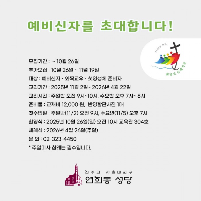 연희동 성당이 설립된 것은 1967년 8월 1일 아현동 본당에서 분할(297세대 912명의신자)하여 마포구 동교동에 있는 동교빌딩 2층(45평)을 임시성당으로 정하고 초대 주임신부로 임세빈 요셉 신부가 부임하였다. 1969년 10월에 (주)인켈의 창업주인 고(故)조동식 프란치스코 형제가 연희동 334-37번지의 495평 대지를 구입 기증하고 건립기금까지 도움을 주어 기공식을 갖고, 1971년 12월 1일 노기남 대주교의 집전으로 축성식을 가졌다.