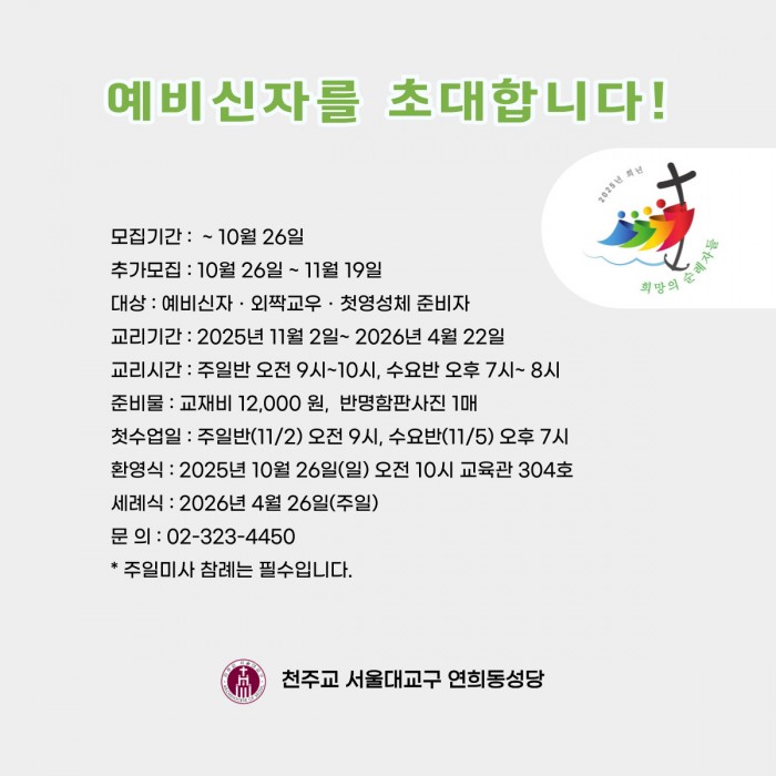 연희동 성당이 설립된 것은 1967년 8월 1일 아현동 본당에서 분할(297세대 912명의신자)하여 마포구 동교동에 있는 동교빌딩 2층(45평)을 임시성당으로 정하고 초대 주임신부로 임세빈 요셉 신부가 부임하였다. 1969년 10월에 (주)인켈의 창업주인 고(故)조동식 프란치스코 형제가 연희동 334-37번지의 495평 대지를 구입 기증하고 건립기금까지 도움을 주어 기공식을 갖고, 1971년 12월 1일 노기남 대주교의 집전으로 축성식을 가졌다.
